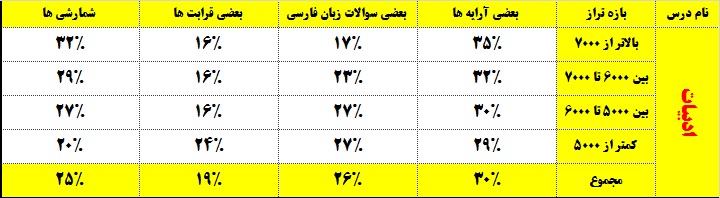 ادبیات: همان طور که در جدول درس ادبیات قابل مشاهده است ، 30 درصد از کنکوری ها بخش آرایه های ادبی را در نوبت اول پاسخ نمی دهند. دو بخش «بعضی از سوالات زبان فارسی و شمارشی ها» ، نیز به ترتیب بخش هایی هستند که کنکوری ها در نوبت اول به آنها پاسخ نمی دهند.جالب اینکه ترازهای برتر به طرز محسوسی بیشتر از بقیه بازه های ترازی به دو بخش «آرایه ها و شمارشی ها» در نوبت اول پاسخ نمی دهند.