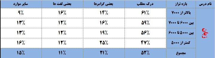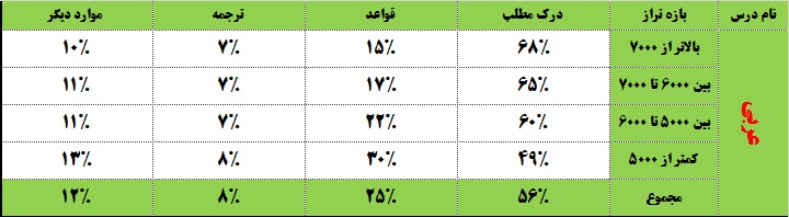 زبان: همان طور که در جدول درس زبان قابل مشاهده است ، بخش درک مطلب با 52 درصد مهم ترین بخشی است که دانش آموزان در نوبت اول به این بخش پاسخ نمی دهند. بخش گرامر نیز با 21 درصد دومین بخشی است که کنکوری ها در نوبت اول به سراغ این بخش نمی روند. ترازهای برتر به طرز محسوسی بیشتر از بقیه بازه های ترازی به بخش درک مطلب در نوبت اول پاسخ نمی دهند و هر چه ترازها کاهش یافته ، گرایش دانش آموزان به کنارگذاشتن بخش گرامرها در نوبت اول ، افزایش پیدا کرده است.