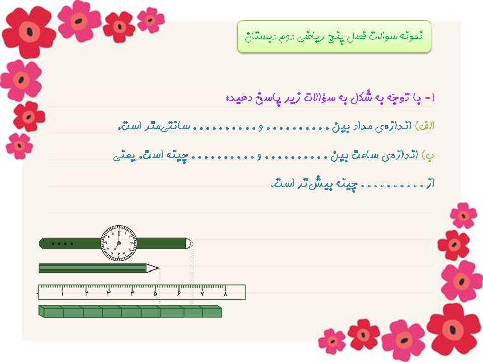 همراهان عزیز دوم دبستان در تصاویر زیر نمونه سوالات درس فصل پنجم ریاضی مقطع دوم دبستان را برای شما قراردادیم.