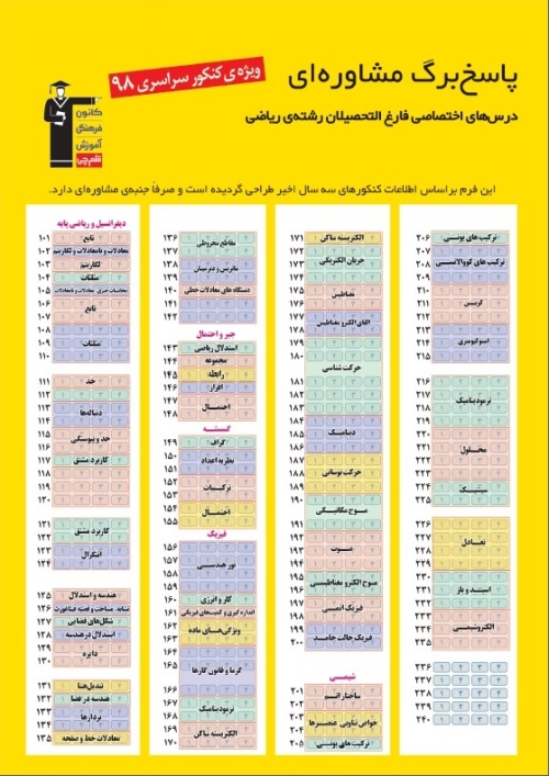 آنگاه بر آن شدیم تا چیدمان مباحث مختلفی را که در کنکور از آن سؤال مطرح میشود شناسایی کرده و در قالب یک پاسخبرگ مشاورهای ارائه کنیم تا شما بتوانید با تمرین 3روز یکبار به کمک این پاسخبرگ مشاورهای، مسیر خود را با آرامش طی کنید.