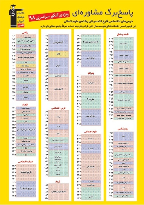 آنگاه بر آن شدیم تا چیدمان مباحث مختلفی را که در کنکور از آن سؤال مطرح میشود شناسایی کرده و در قالب یک پاسخبرگ مشاورهای ارائه کنیم تا شما بتوانید با تمرین 3روز یکبار به کمک این پاسخبرگ مشاورهای، مسیر خود را با آرامش طی کنید.