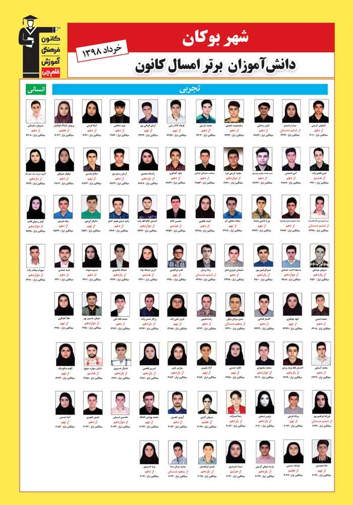 ویژه نامه ی برترها که شامل دانش آموزان برتر کنکوری سال 98 کانون در شهر بوکان است را در ادامه مشاهده و دانلود کنید.برای مشاهده نفرات برتر سایر گروه های شهر بوکان و پروفایل شخصی برترها برروی لینک زیر کلیک کنید.نفرات برتر سال 98 در شهر بوکان