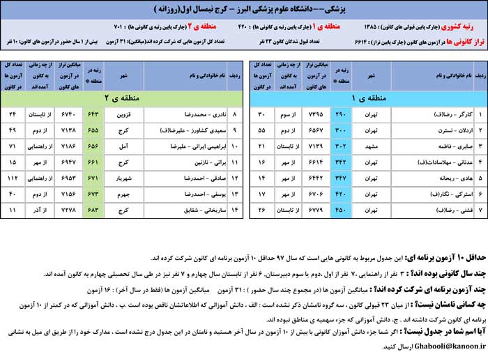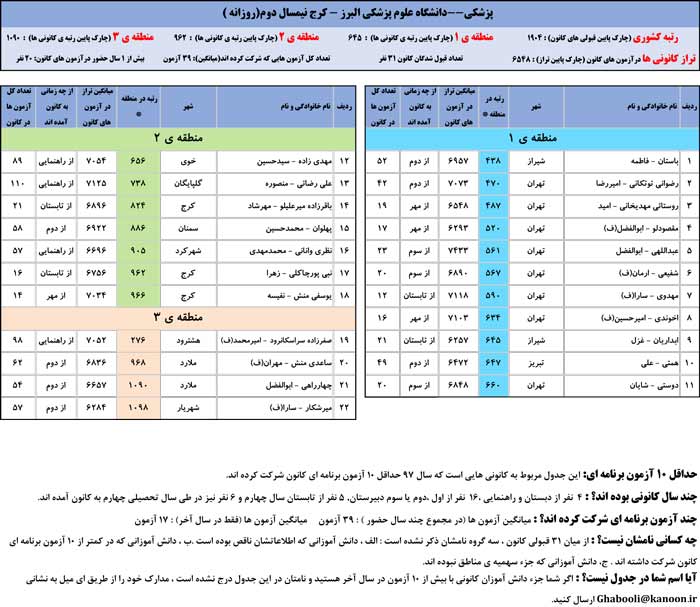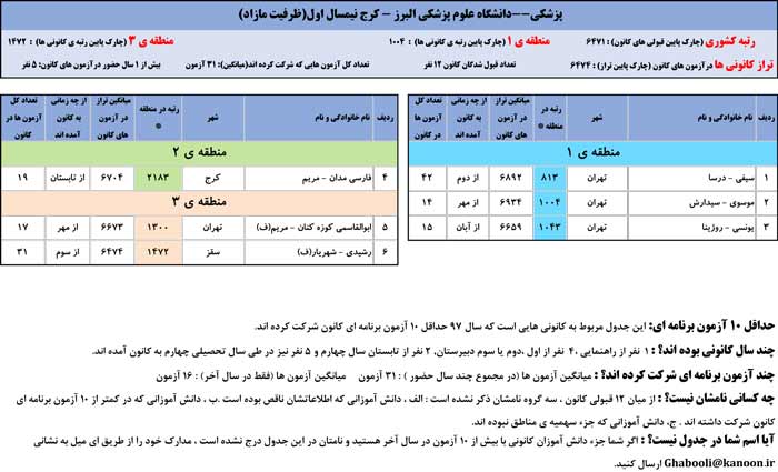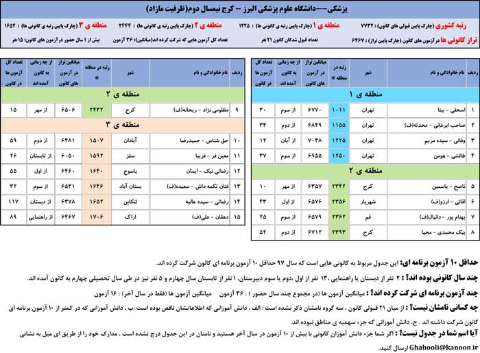 یادگار ماندگار : قبولی های کانونی دانشگاه علوم پزشکی البرز - کرج در همه رشته ها در سال 97 را در ادامه مشاهده کنید.