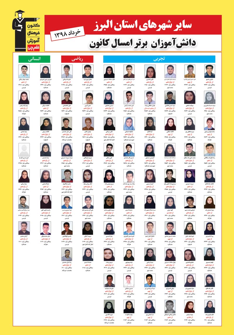 برای مشاهده نفرات برتر سایر گروه های شهرهای استان البرز و پروفایل شخصی برترها برروی لینک زیر کلیک کنید.