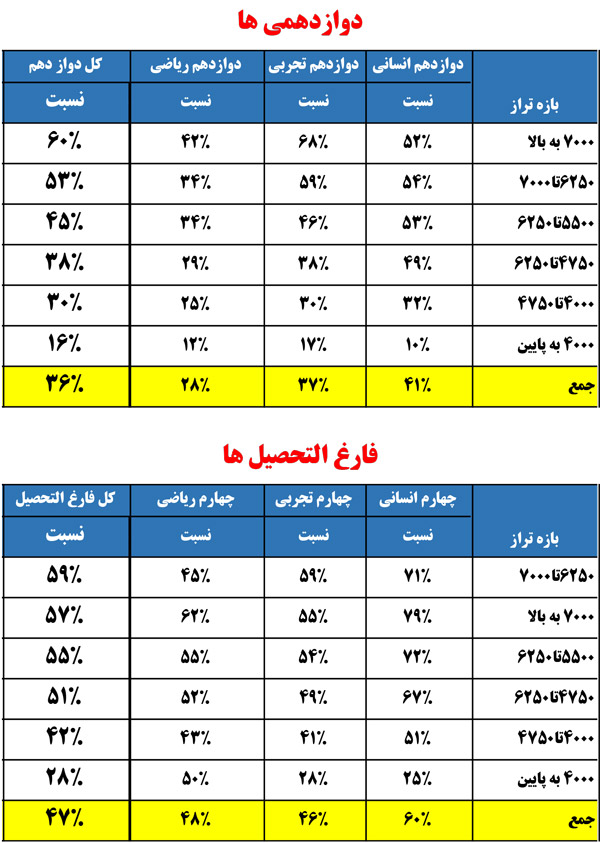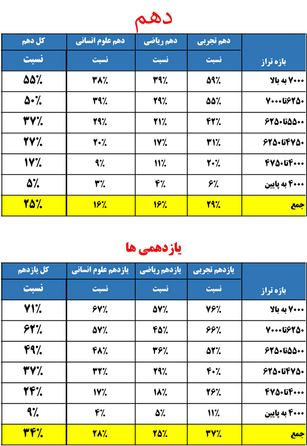 چنانچه در جدول های زیر مشاهده می کنید در همه ی گروه ها دانش آموزان کانونی با تراز بالاتر به نسبت بیشتری برای شرکت در این آزمون ها ثبت نام کرده اند.