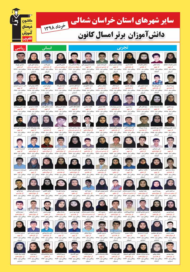 ویژه نامه ی برترها که شامل دانش آموزان برتر کنکوری سال 98 کانون در سایر شهرهای استان خراسان شمالی است را در ادامه مشاهده و دانلود کنید.