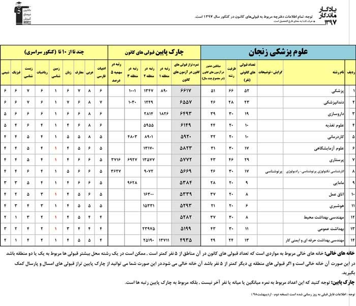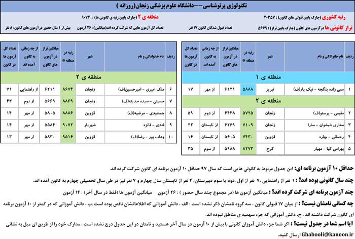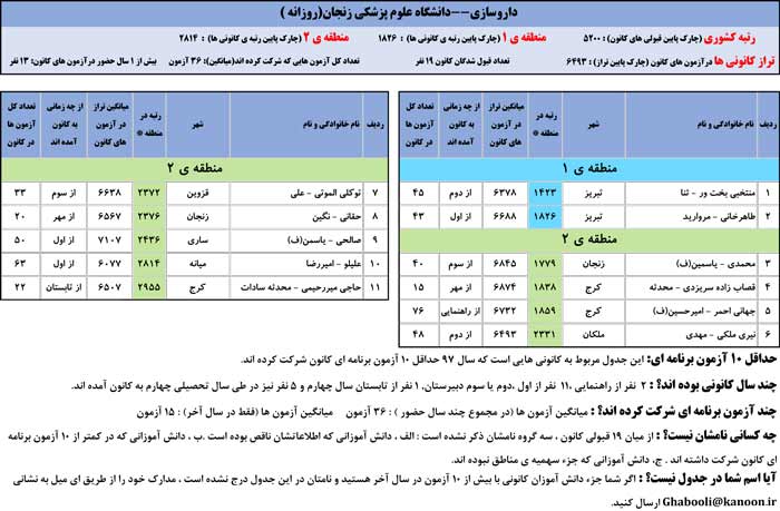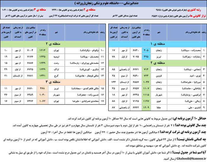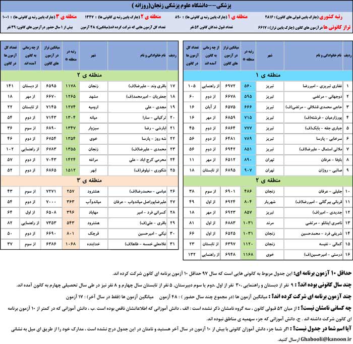 یادگار ماندگار : قبولی های کانونی دانشگاه علوم پزشکی زنجان در همه رشته ها در سال 97 را در ادامه مشاهده کنید.فایل با کیفیت قبولی های سال 97 را در قسمت فایل های ضمیمه دانلود کنید.