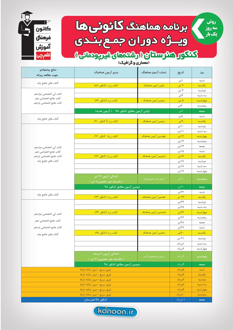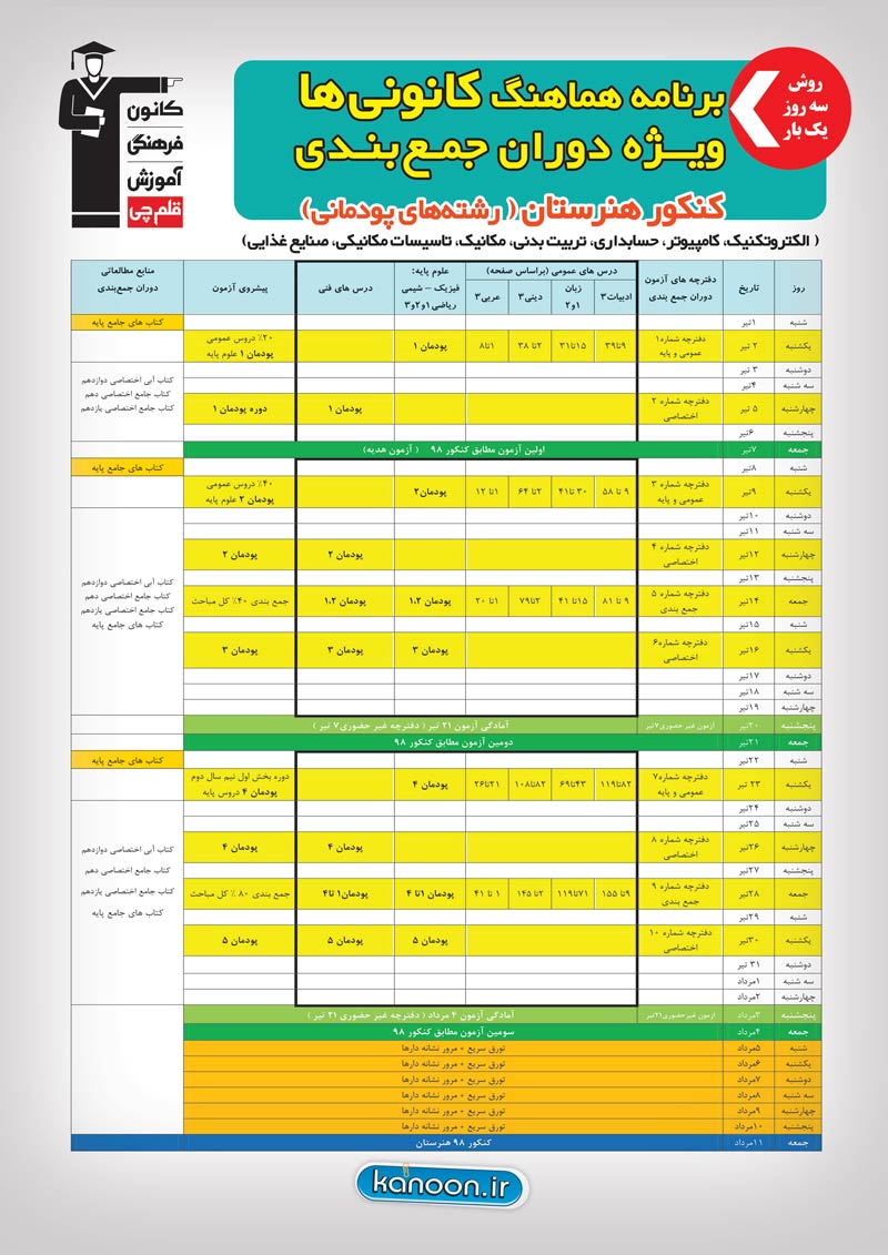 با توجه به این که امسال در 9 رشته هنرستان کنکور برگزار میگردد، برنامه دقیق و کاملی را در سرتاسر کشور برای اولین کنکور نظام 3-3-6 هنرجویان هنرستان آماده کردهایم. بر همین اساس دوران جمع بندی را به آزمون های مطابق کنکور اضافه کرده تا مطالعه هنرجویان دارای ریتم و آهنگ منظمی شود و علاوه بر آن هنرجویان تعداد آزمون های بیشتری را تجربه کنند تا خلاء پیش آمده از تاخیر اعلام زمان کنکور جبران گردد.