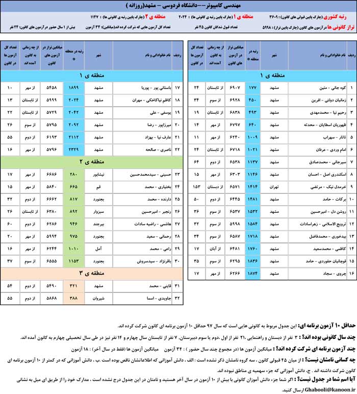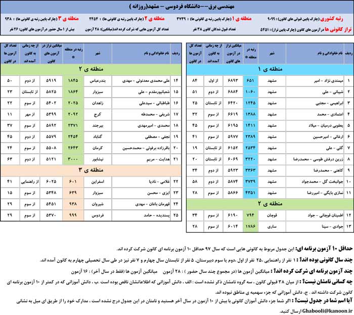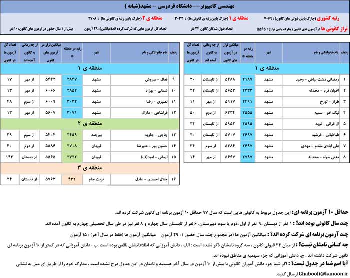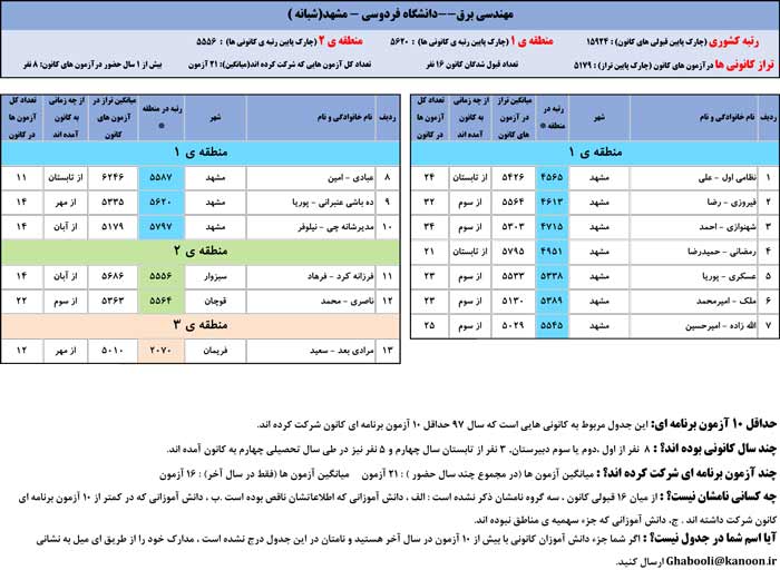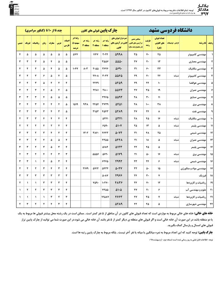 یادگار ماندگار : قبولی های کانونی دانشگاه های فردوسی مشهد و علوم پزشکی مشهد در همه رشته ها در سال 97 را در ادامه مشاهده کنید.فایل با کیفیت قبولی های سال 97 را در قسمت فایل های ضمیمه دانلود کنید.