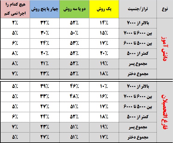جدول زیر مقایسه میزان استفاده دانش آموزان و فارغ التحصیلان ترازهای مختلف از این 5 روش می باشد: