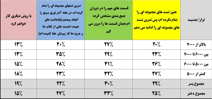 در گزینه 1 ، دانش آموز عنوان کرده تست های مجموعه ای را به اتمام نرسانده و قصد دارد تمرین این تست ها را ادامه دهد. در گزینه 2 ، دانش آموز اعلام می کند که به مطالعه قسمت های مهمی که در دوران جمع بندی مشخص کرده ، خواهد پرداخت و در گزینه 3 ، دانش آموز بیان کرده که تست های مجموعه ای را به اتمام رسانده و در هفته آخر تورق سریع را انجام می دهد. همان گونه که در جدول قابل مشاهده است ، میزان پاسخ به گزینه های 1 ، 2 و 3 بسیار نزدیک به هم می باشد. این بدان معناست که در هفته منتهی به کنکور ، طیف های مختلفی از دانش آموزان با ویژگی ها و برنامه های متفاوت مطالعاتی وجود دارند.