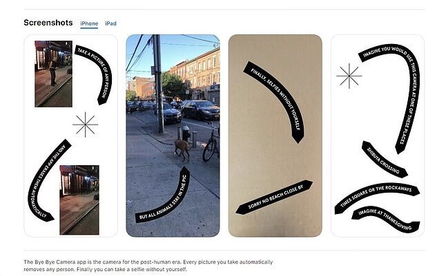 این اپلیکیشن که Bye Bye Camera نام دارد، در حقیقت ترکیب یک پروژه هنری و اپلیکیشن است.این اپلیکیشن با استفاده از ابزارهای هوش مصنوعی که در فناوری شناسایی صورت به کار می رود افراد را در تصاویر شناسایی می کند. همچنین برای شناسایی اشیا در تصاویر نیز الگوریتمی به نام YOLO را به کار می برد