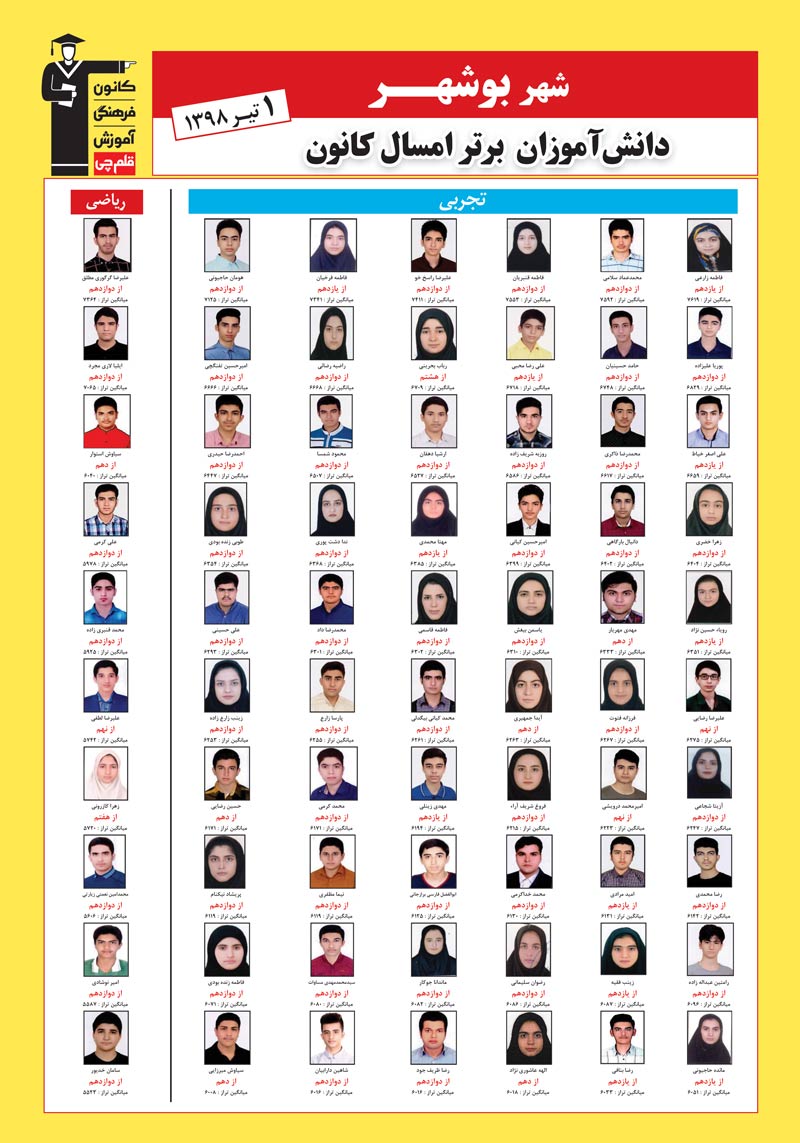 ویژه نامه ی برترها که شامل دانش آموزان برتر کنکوری سال 98 کانون در شهر بوشهر است را در ادامه مشاهده و دانلود کنید.