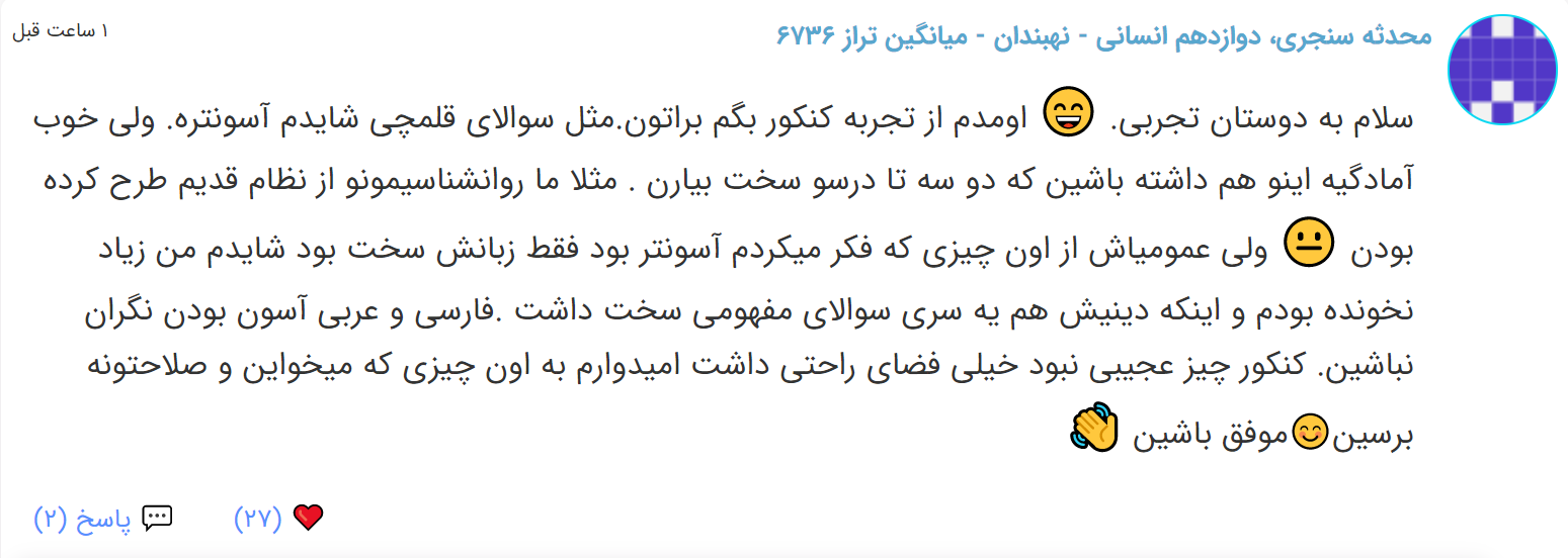 با سلام و عرض خسته نباشید خدمت کنکوری های عزیزدر این مطلب نظرات دانش آموزان کانونی رشته ی انسانی را راجع به سطح دشواری سوالات کنکور 98 برای شما عزیزان جمع آوری کرده ایم...