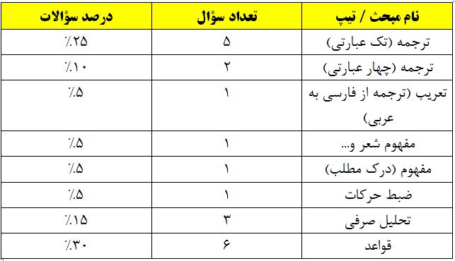 به نسبت کنکور سال های پیش، سهم سؤالات ترجمه، مفهوم و تحلیل صرفی افزایش یافته است، در حالی که سهم سؤالات تعریب، ضبط حرکات و قواعد کم شده است.