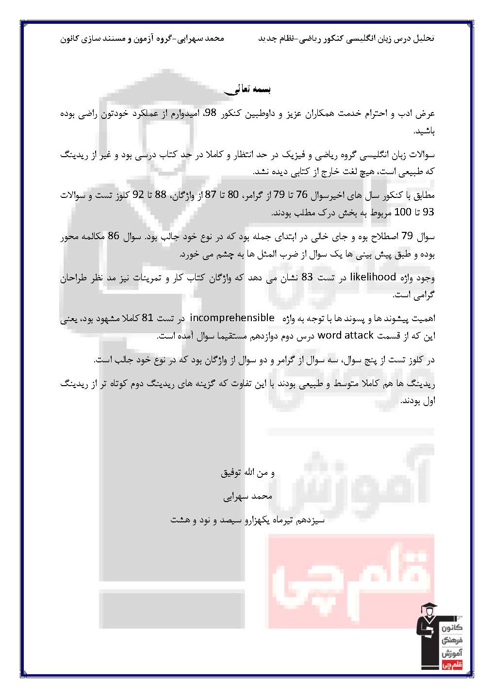تحلیل درس زبان انگلیسی در کنکور 98 رشته ریاضی توسط محمد سهرابی