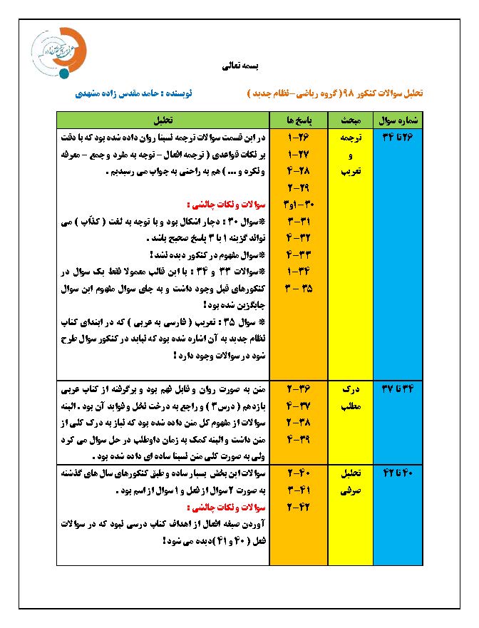 حامد مقدس زاده مشهدی: تحلیل درس عربی کنکور 98 ریاضی نظام جدید
