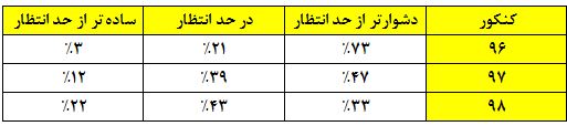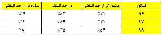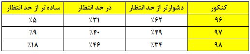 در جدول های زیر نظر دانش آموزان در مورد سطح دشواری دروس عمومی کنکور 98 را در مقایسه با دو سال گذشته مشاهده می کنید.