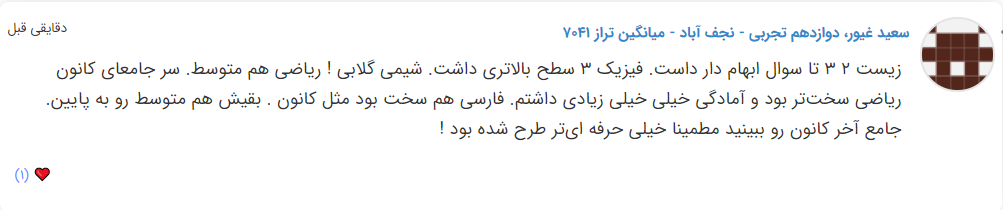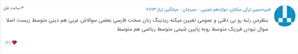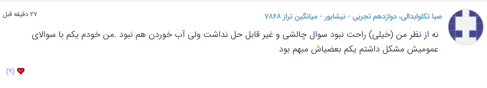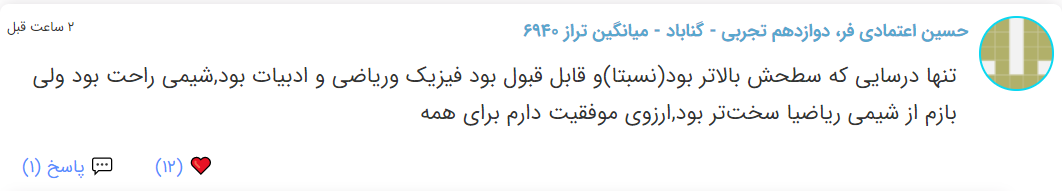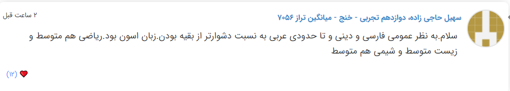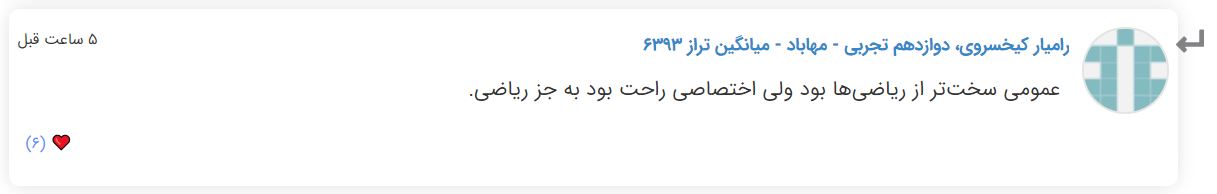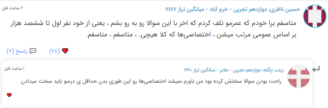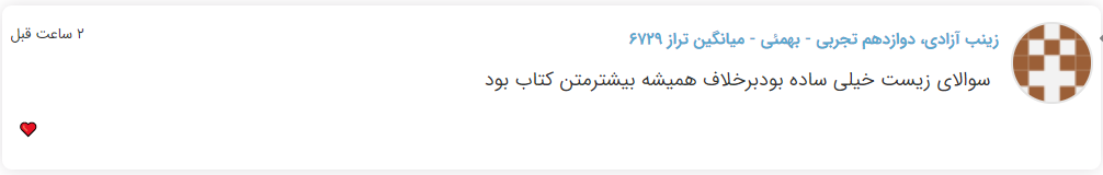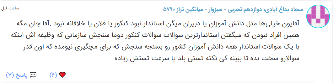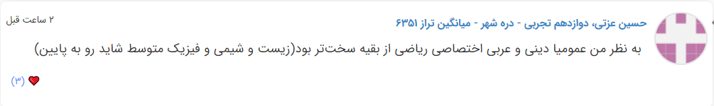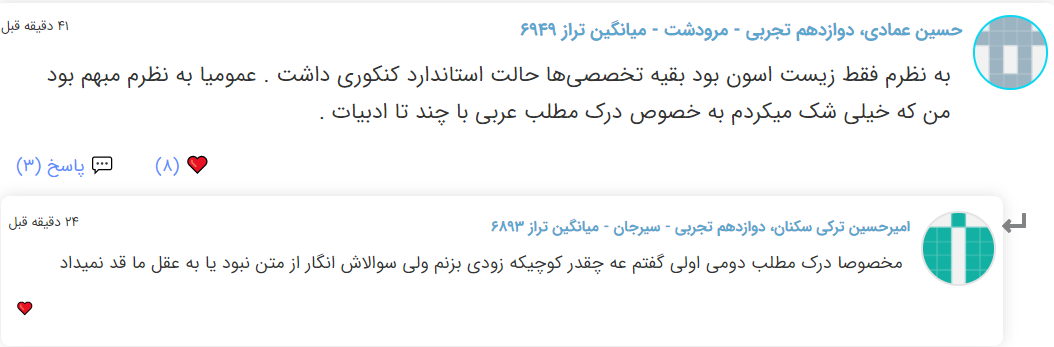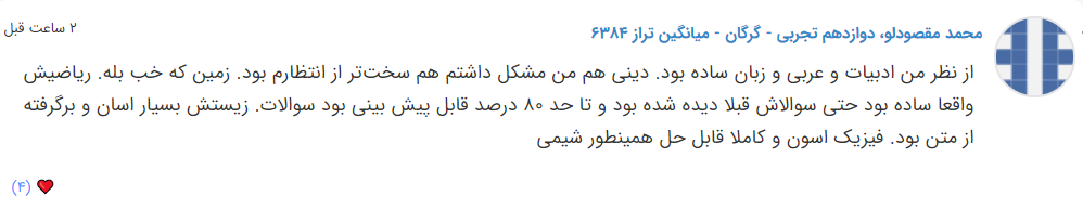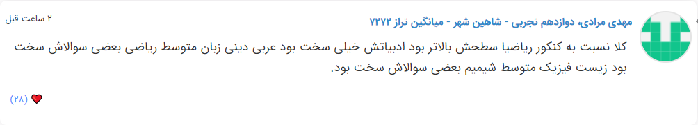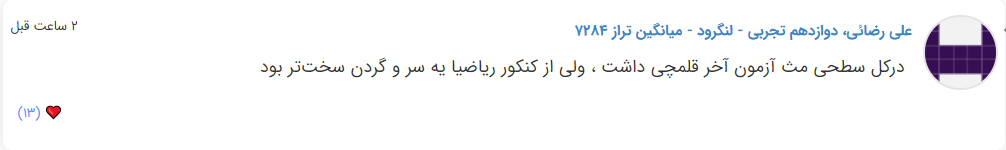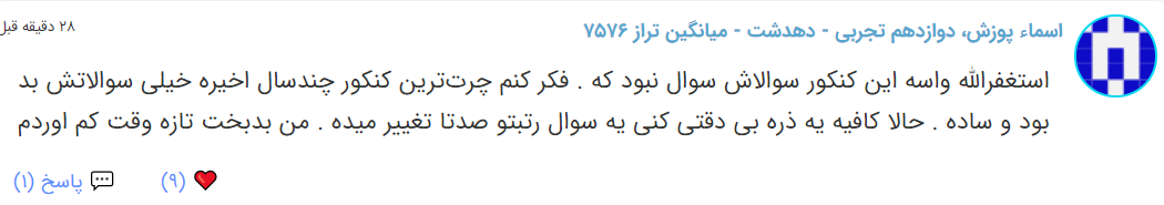 پس از برگزاری آزمون ها تعداد زیادی کامنت درباره ی سطحدشواری آزمون ها داشتیم . در این میان اظهار نظر دانش آموزانی که با صفحه ی شخصی خودشان نظر دادند قابل اعتمادتر است زیرا دارای هویت مشخص و سطح تراز دانش آموز است و معلوم می شود اگر دانش آموزی می گوید سوال های یک درس از نظر او ساده یا دشوار بوده است وضعیت درسی خود او چگونه است . اکنون که این مطلب را مطالعه می کنید در صورتی که خود شما هم تمایل دارید می توانید نظر خود را از طریق صفحه ی شخصی تان در قسمت کامنت ها (نظرات) بنویسید . در این مطلب فقط نظراتی تایید خواهند شد که با صفحه ی شخصی ارائه شوند .