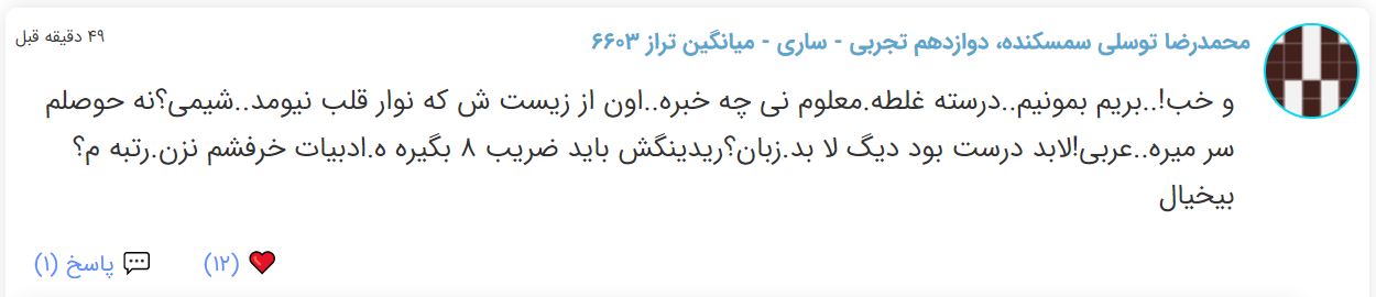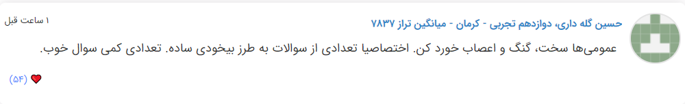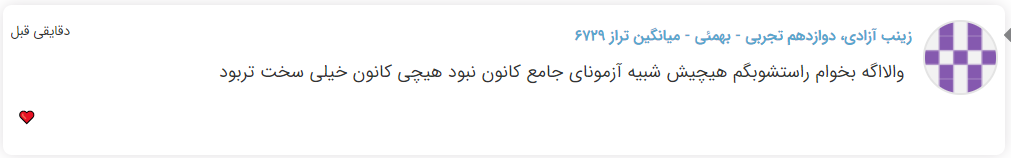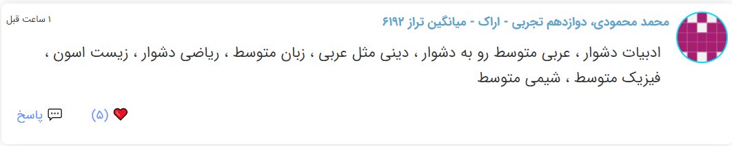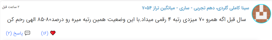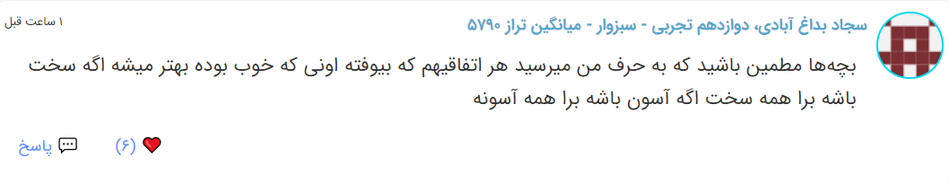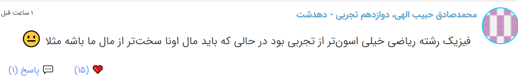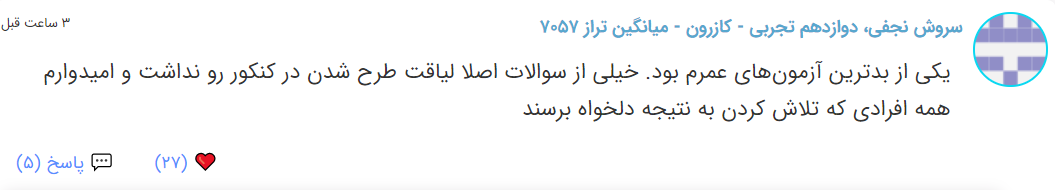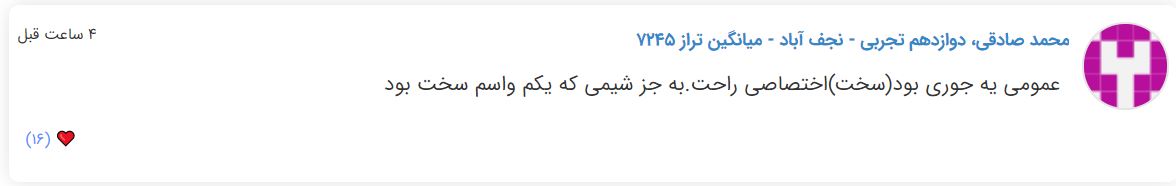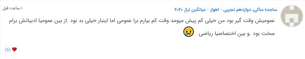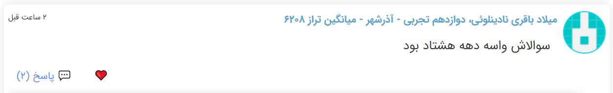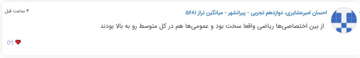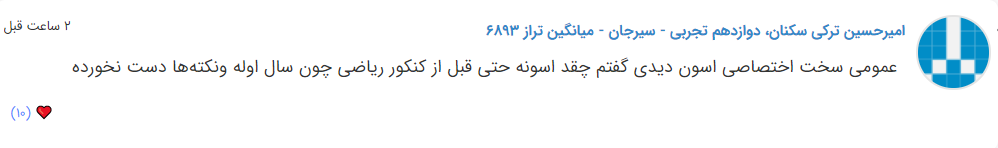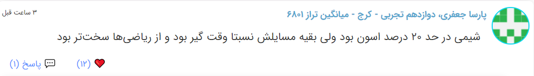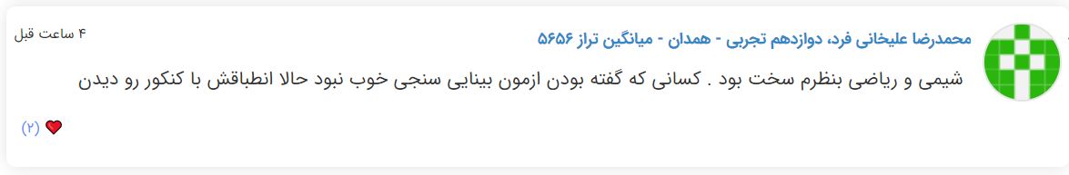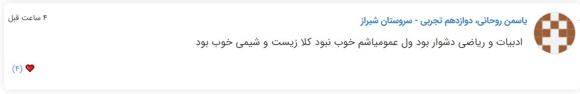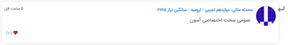 پس از برگزاری آزمون ها تعداد زیادی کامنت درباره ی سطحدشواری آزمون ها داشتیم . در این میان اظهار نظر دانش آموزانی که با صفحه ی شخصی خودشان نظر دادند قابل اعتمادتر است زیرا دارای هویت مشخص و سطح تراز دانش آموز است و معلوم می شود اگر دانش آموزی می گوید سوال های یک درس از نظر او ساده یا دشوار بوده است وضعیت درسی خود او چگونه است . اکنون که این مطلب را مطالعه می کنید در صورتی که خود شما هم تمایل دارید می توانید نظر خود را از طریق صفحه ی شخصی تان در قسمت کامنت ها (نظرات) بنویسید . در این مطلب فقط نظراتی تایید خواهند شد که با صفحه ی شخصی ارائه شوند .