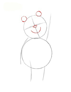 حالا دو دايره کوچک براي گوش و يک مثلث براي بيني و يک نيم دايره براي دهان پو مطابق شکل ميکشيم.