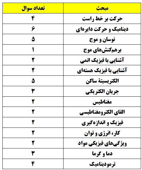 تعداد 11 سوال از فیزیک دهم، 12 سوال فیزیک یازدهم و 22 سوال از فیزیک دوازدهم طرح شده بود. که سهم هر مبحث در جدول زیر آورده شده است. البته از این تعداد دو سوال ترکیبی مربوط به حرکتشناسی و کار، انرژی و توان و یک سوال ترکیبی هم دینامیک و کار، انرژی توان بود. سطح سوالات متوسط و در سطح کتاب درسی طرح شده بود.