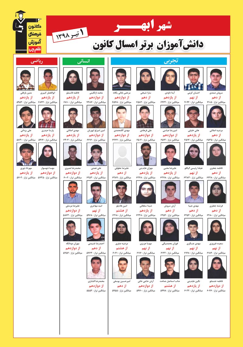 ویژه نامه ی برترها که شامل دانش آموزان برتر کنکوری سال 98 کانون در شهر ابهر است را در ادامه مشاهده و دانلود کنید.
