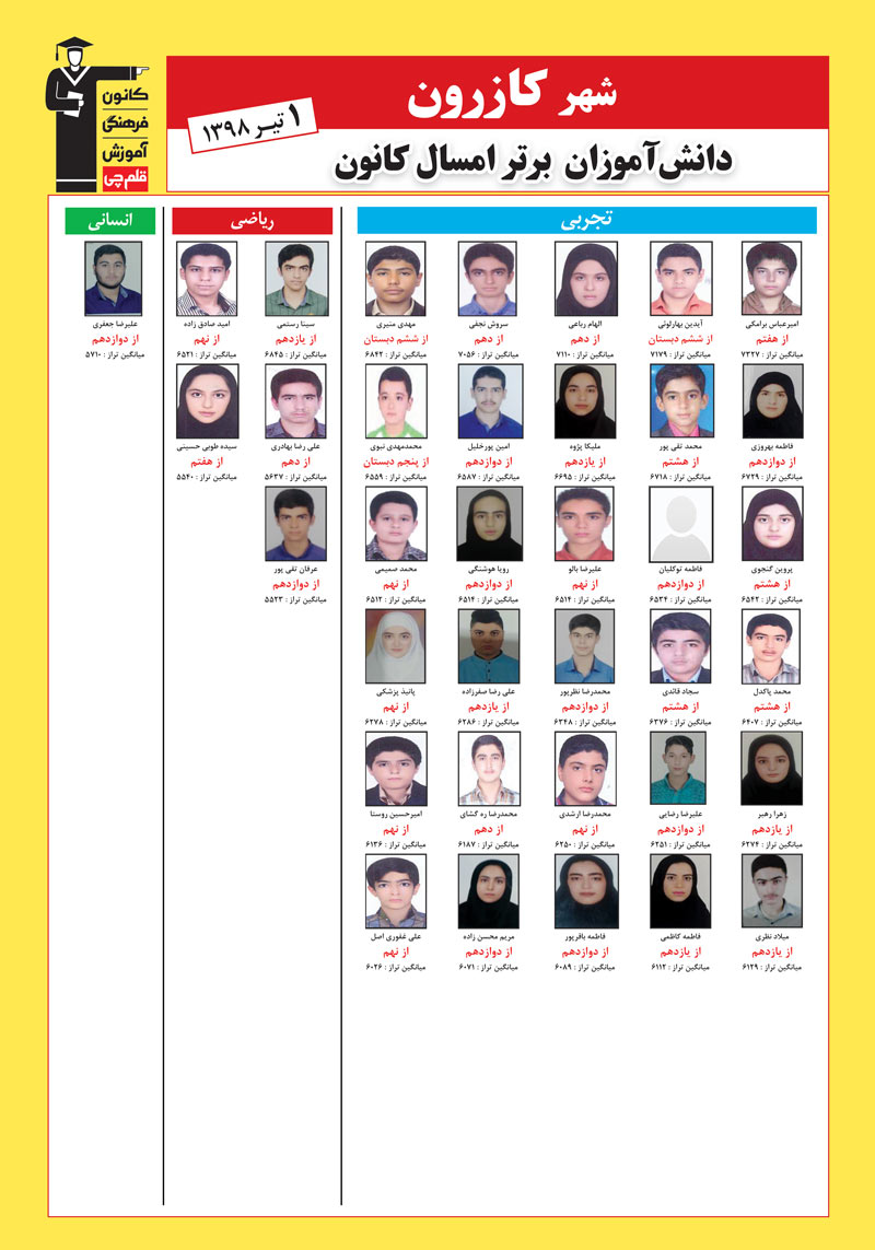 ویژه نامه ی برترها که شامل دانش آموزان برتر کنکوری سال 98 کانون در شهر کازرون است را در ادامه مشاهده و دانلود کنید.