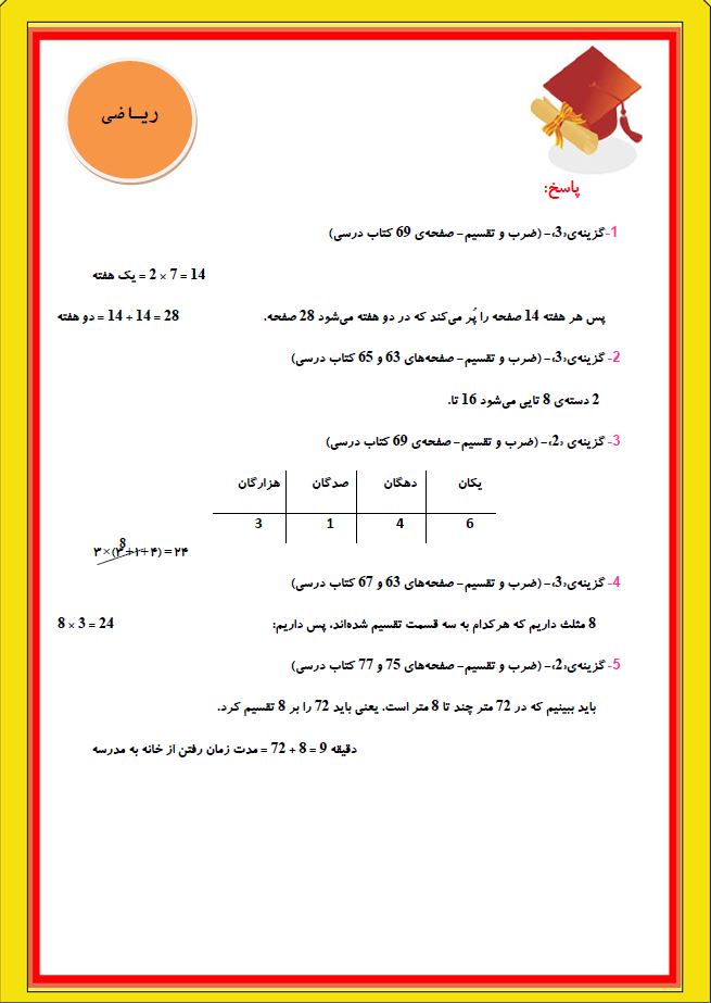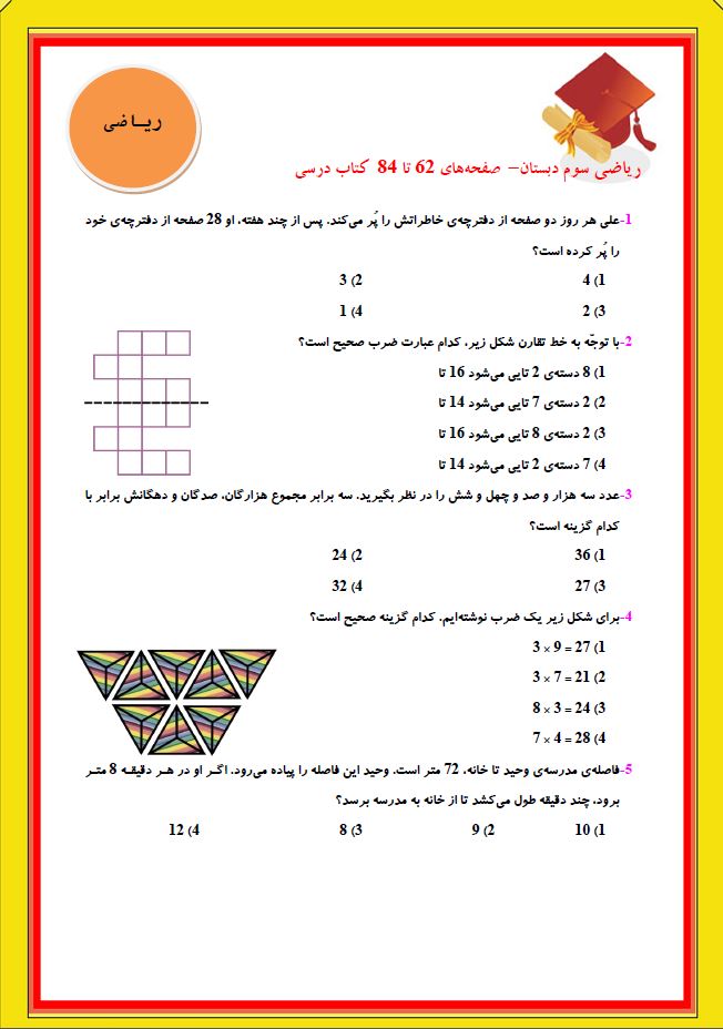 نمونه سوال تستی درس ریاضی سوم دبستان صفحه ی 62 تا 84 + پاسخ