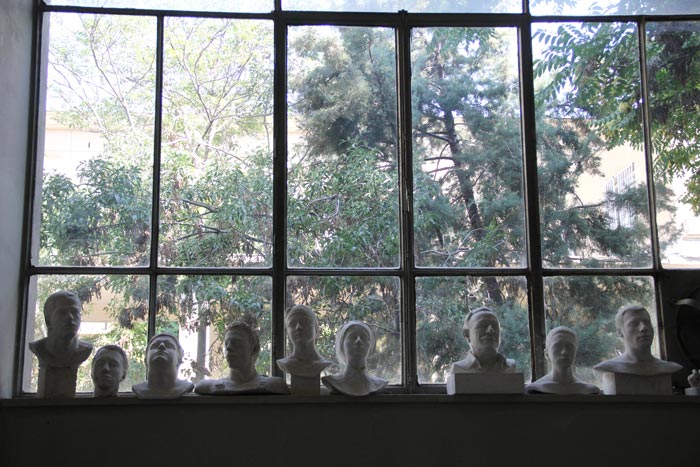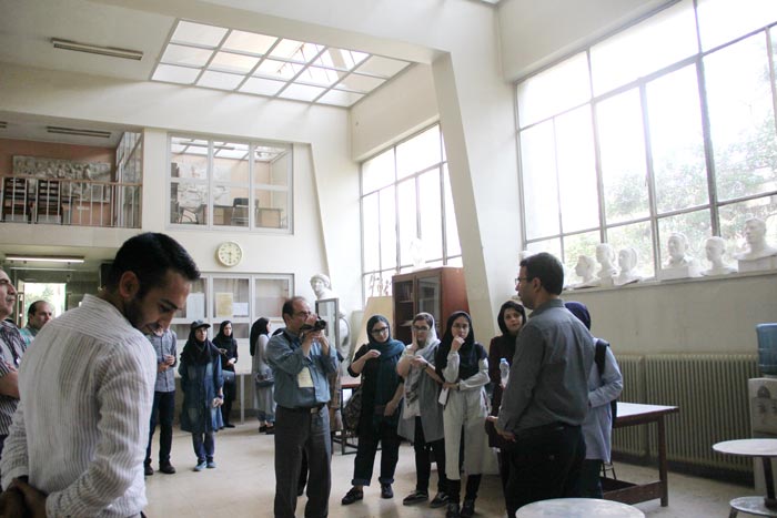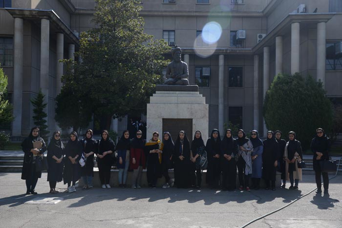عکس یادگاری دانش آموزان منطقه مشیریه تهران در مقابل مجسمه فردوسی در ورودی دانشکده ادبیات