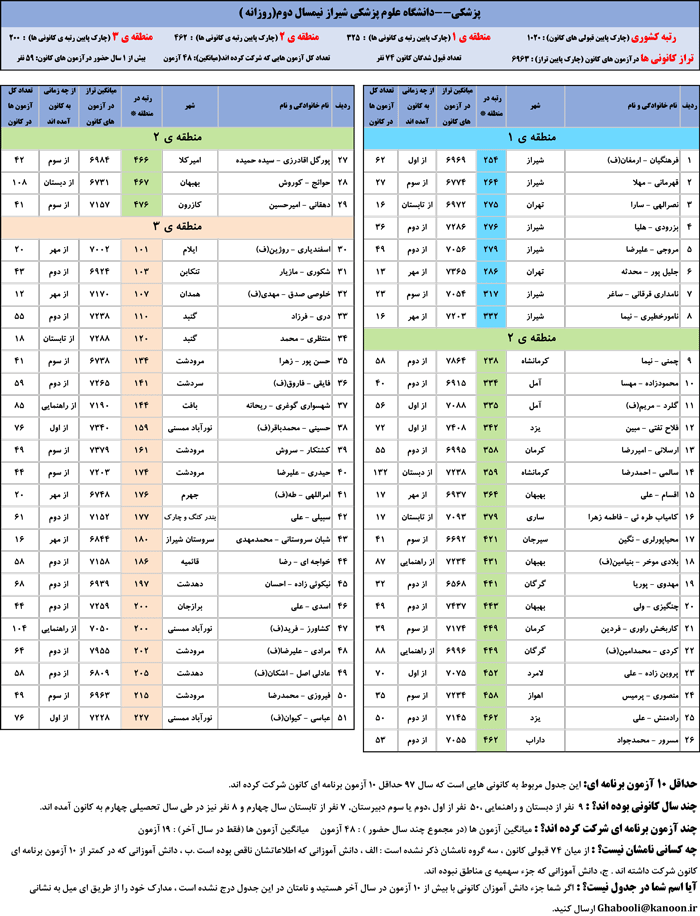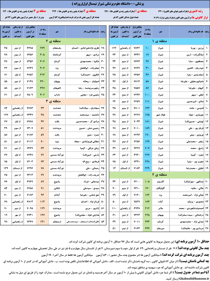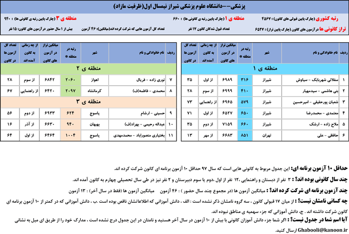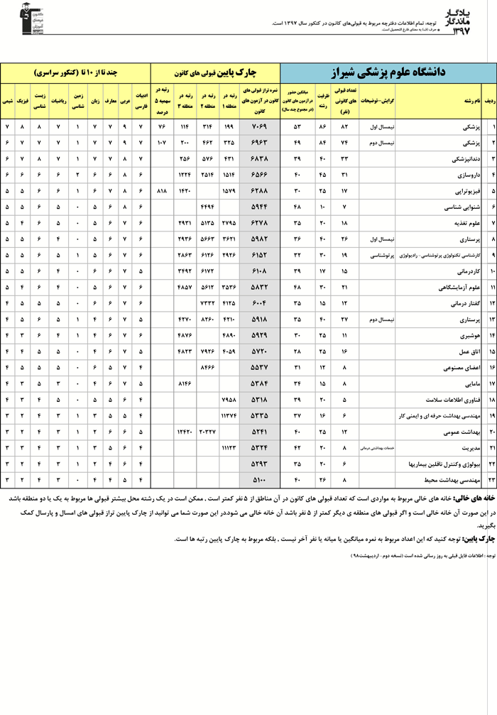 یادگار ماندگار : قبولی های کانونی دانشگاه های شیراز و صنعتی شیراز و علوم پزشکی شیراز در همه رشته ها در سال 97 را در ادامه مشاهده کنید.فایل با کیفیت قبولی های سال 97 را در قسمت فایل های ضمیمه دانلود کنید.