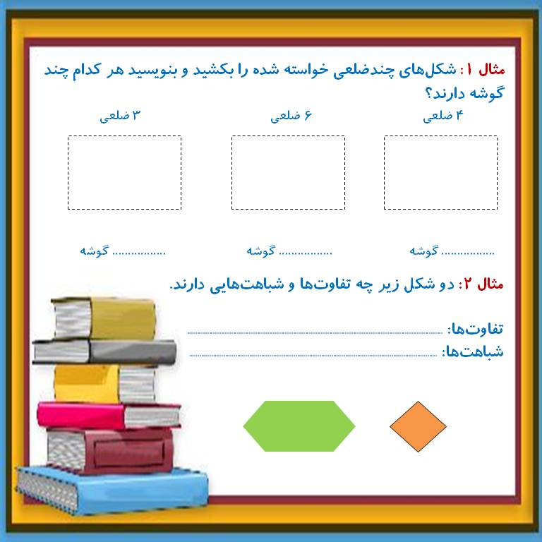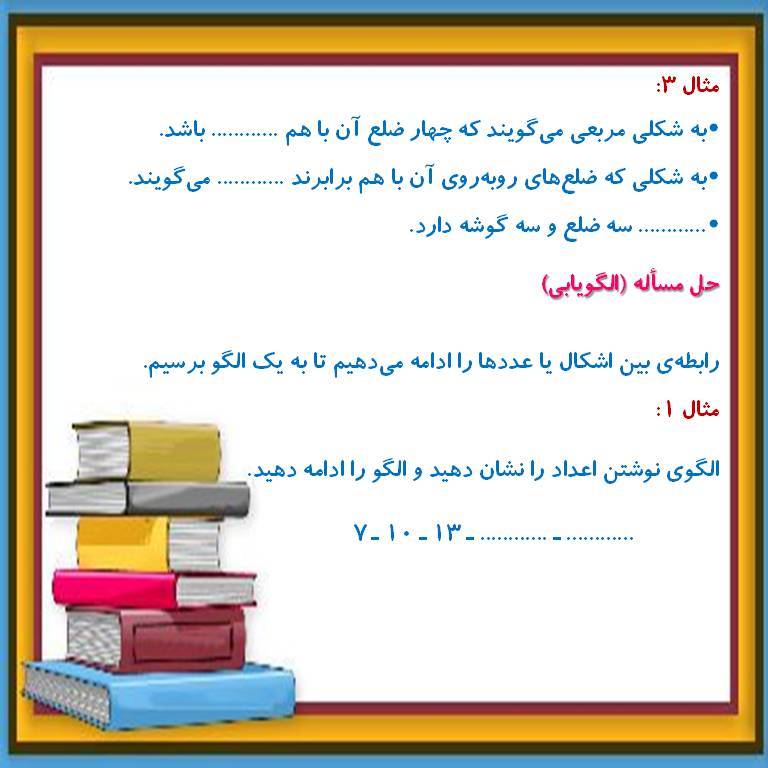 در تصاویر زیر، درسنامه مربوط به فصل سوم ریاضی دوم‌دبستان، مبحث اشکال هندسی، توضیح داده‌ شده‌است.