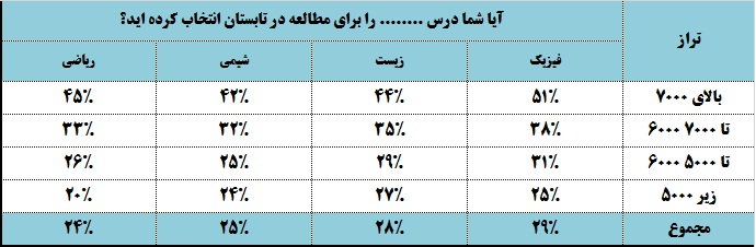 همان طور که در جدول قابل مشاهده است ، از بین دانش آموزانی که دروس سال دوازدهم را برای تابستان انتخاب کرده اند ، 29 درصد درس فیزیک را انتخاب کرده اند. زیست با 28 درصد گرایش در رده دوم است و به دروس شیمی و ریاضی نیز به ترتیب 25 و 24 درصد گرایش وجود داشته است.