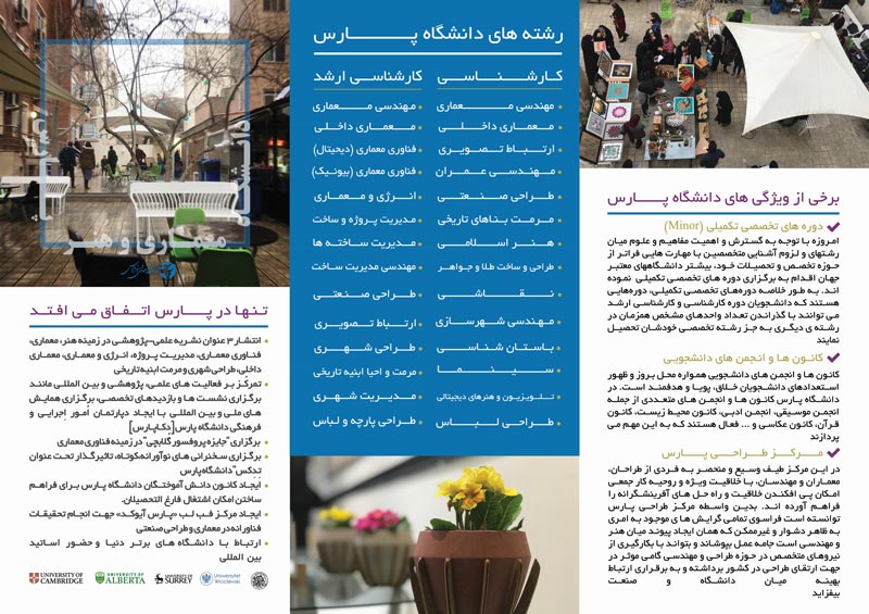 دانشگاه پارس-دانشگاه اساتید برتر (دانشگاه سطح یک بر اساس نظام رتبهبندی سال ١٣٩٤ وزارت علوم، تحقيقات و فناوري) در رشتههاى زیر و بر اساس سوابق تحصيلي در مقطع “كارشناسي پيوسته" دانشجو مي پذيرد: