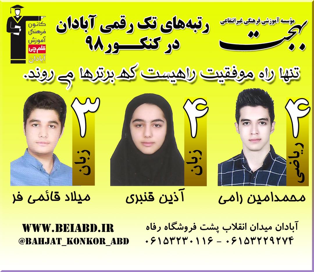 رتبه های تک رقمی آبادان در کنکور 98 را در زیر مشاهده کنید ...