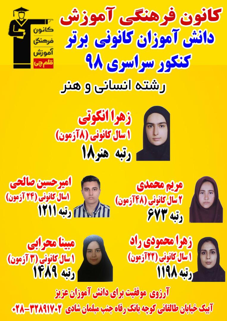 رتبههای برتر کنکور 98 در سه رشته ریاضی ،انسانی ،هنر از آبیک در زیر مشاهده میکنید