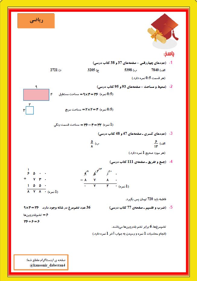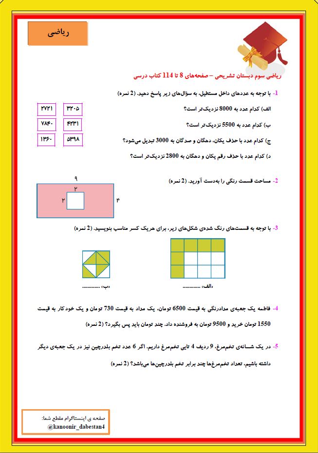 نمونه سوال تشریحی درس ریاضی سوم دبستان صفحه ی 8 تا 114 + پاسخ