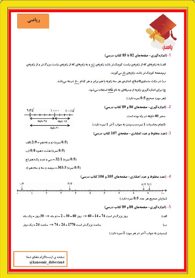 نمونه سوال تشریحی درس ریاضی چهارم دبستان صفحه ی 76 تا 107 + پاسخ