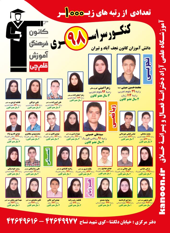 رتبههای برتر کنکور 98 در نمایندگی نجف آباد و تیران را در زیر مشاهده کنید ....