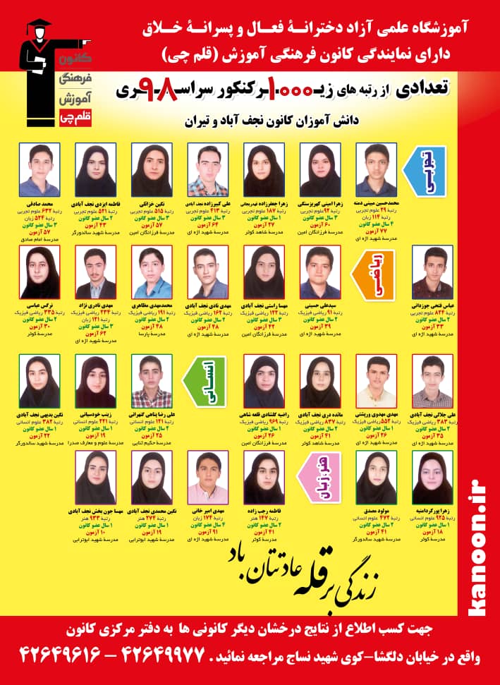 رتبه های برتر کنکور 98 در نمایندگی نجف آباد و تیران را در زیر مشاهده کنید ....
