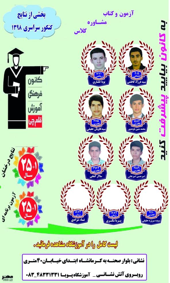 رتبه های برتر کنکور 98 در نمایندگی کرمانشاه را در زیر مشاهده کنید ....
