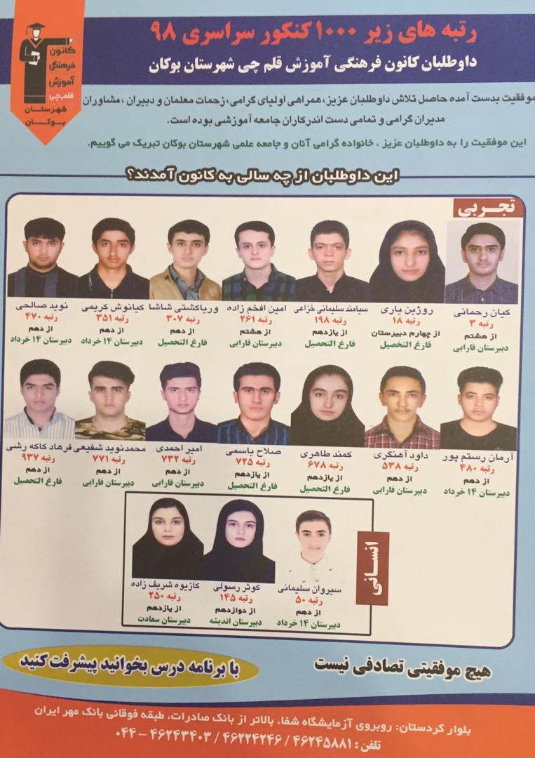 رتبههای برتر کنکور 98 بوکان را در زیر مشاهده میکنید