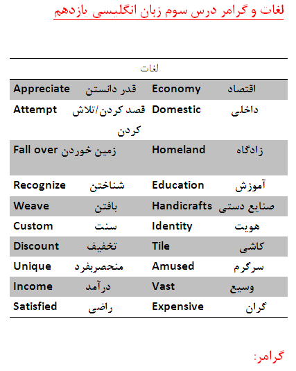لغت و گرامر درس سوم زبان انگلیسی یازدهم منطبق باآزمون 5مهر