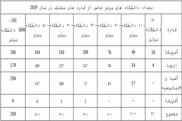 در جدول زیر وضعیت تعداد دانشگاه های قاره های مختلف به تفکیک مشخص شده است.