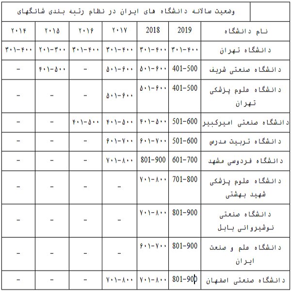 وضعیت دانشگاه های ایران در رتبه بندی شانگهای