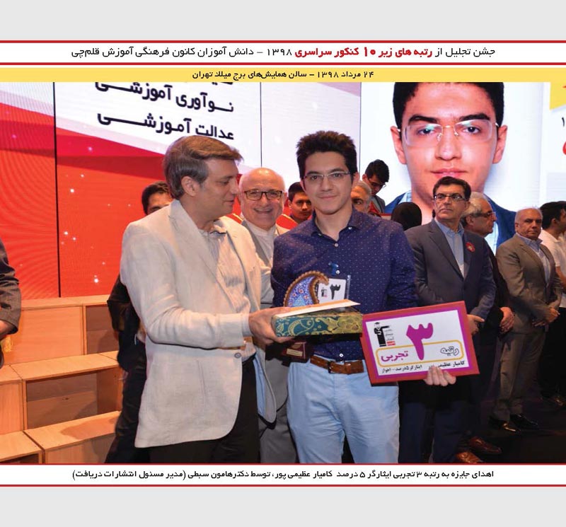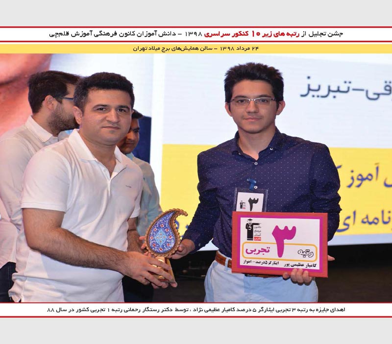 تجلیل ازکامیار عظیمینژاد رتبه3 تجربی ایثارگر و رستگار رحمانی رتبه 1 کنکور 88 درجشن نخبگان 98 را مشاهده می کنید