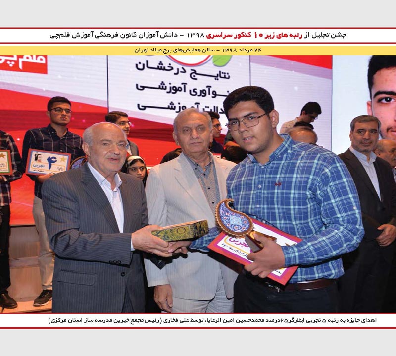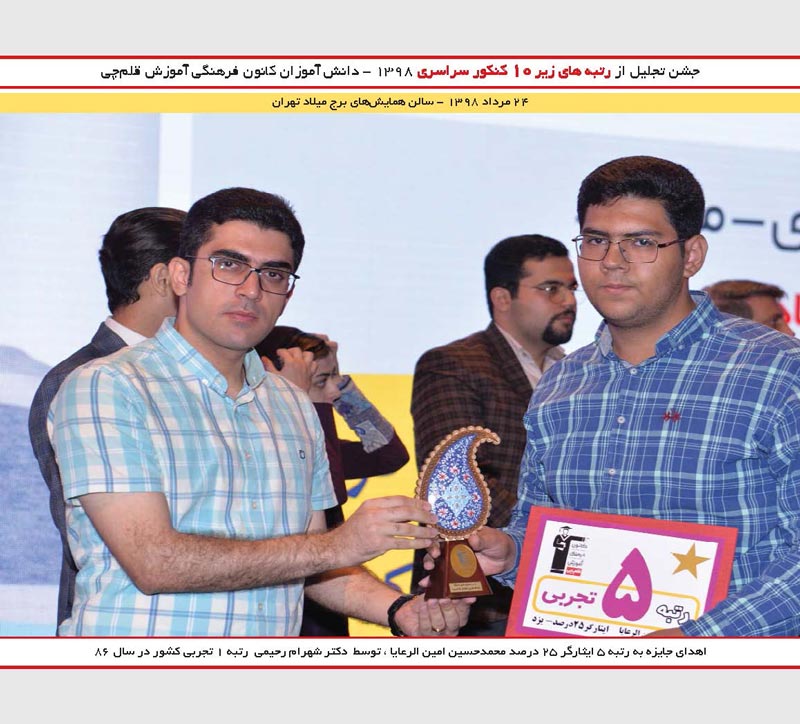 تجلیل از محمدحسین امین الرعایا رتبه 5 تجربی ایثارگر وشهرام رحیمی رتبه 1 کنکور86 را در جشن نخبگان 98 را مشاهده میکنید