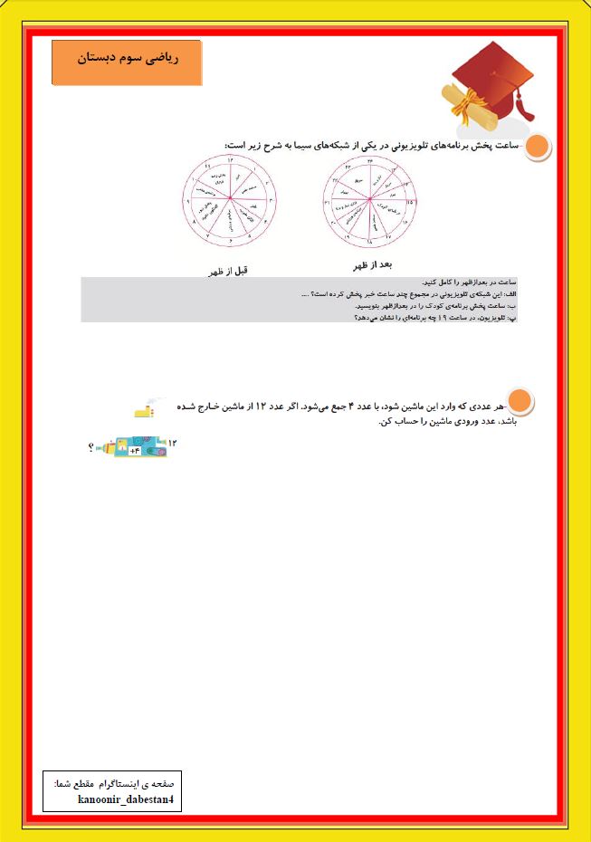 عکس هایی که در ادامه قرار گرفته است،نمونه سوالات درس ریاضی سوم دبستان میباشد که توسط فاطمه احدزاده دانشجوی رشتهی مهندسی پلیمر دانشگاه تهران تهیه شده است.