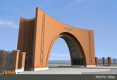 اين سردر نماد مشخصي از ورودي کاخ مداين تيسفون است که به علت ويژگي زيباي قوس اين کاخ، سالهاي متوالي است که مورد توجه معماران ايراني و خارجي قرار گرفته است. اين طرح برگرفته از معماري ايراني اسلامي است و فضاي علم و دانشاندوزي را تداعي ميکند. به اين ترتيب که از سمبل علم که کتاب است، گرفته شده و مانند يک کتاب طراحي شده است. از سوي ديگر به کارگيري نماي آجري و طاق سهمي در ورودي بنا، برگرفته از معماري ايراني است. از سوي ديگر طاق و طرفين آن با کاربندي و کاشي کاريها و همچنين نقوش اسلامي مزين شده است.