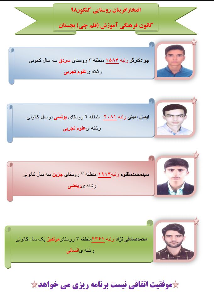 درخشش دانش آموزان روستایی بجستان در کنکور 98 را در زیر مشاهده میکنید